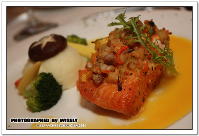 這是同行朋友點的創意鮮魚排,它佐以芋泥鮮菇;經過慢火烘烤的新鮮魚排,